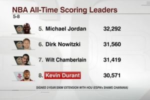 杜兰特在NBA职业生涯总得分榜上排名第八(30571),若按照上赛季场均得分(26.6分),只需要65场比赛,他将超越迈克尔-乔丹(32292)。
