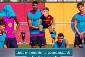 照片中,阿劳霍和队友合影,手中P上了婴儿加维,并写道:“美好的训练时光,有儿子相伴左右。”